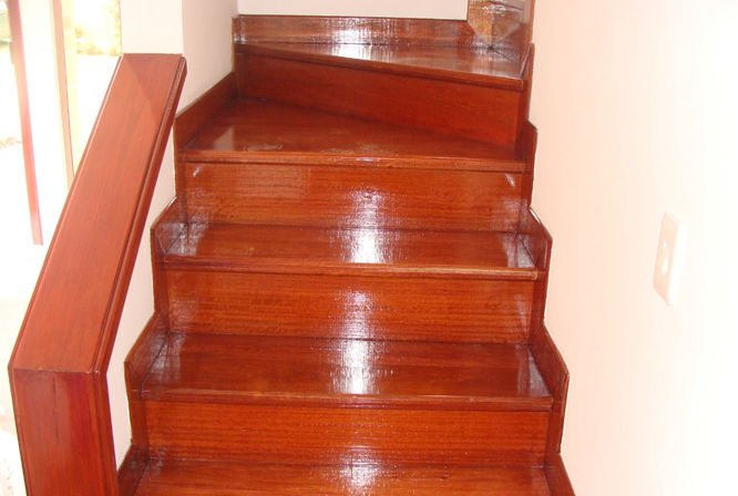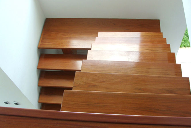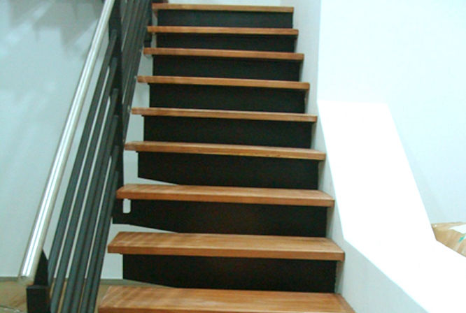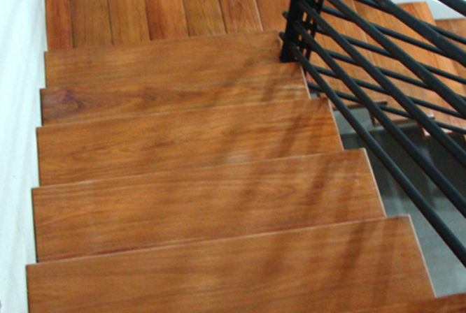 Este revestimiento se hace en madera maciza o laminada, paso y contrapaso, se incluye la instalación del guardaescoba.