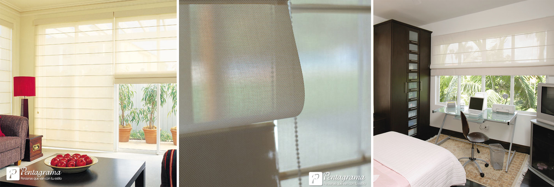 Están disponibles en dos presentaciones especiales y únicas llamadas: Dos en Uno (una romana en blackout y una romana en una tela traslúcida fabricadas en un mismo cabezal) y Top Down Botton Up (los pliegues recogen hacia arriba o hacia abajo).