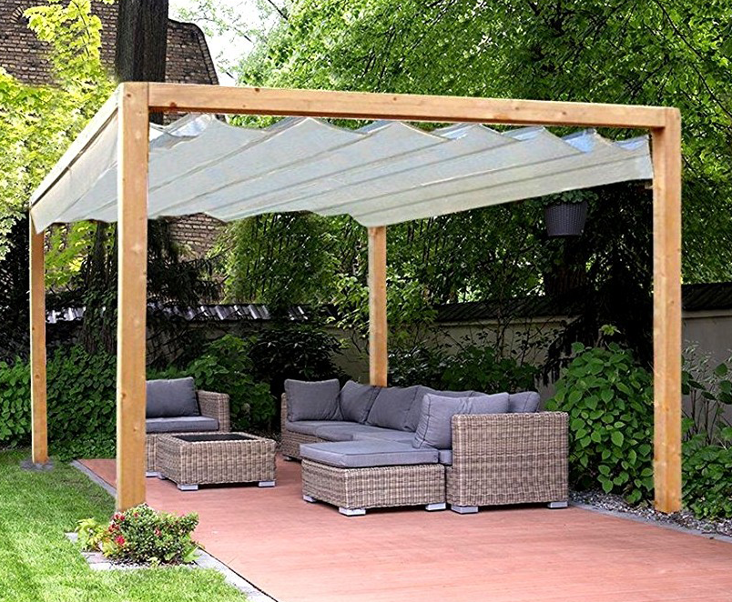 Nuestra pérgola consiste en una estructura formada por columnas rectangulares y un techo retráctil en forma de pliegues.